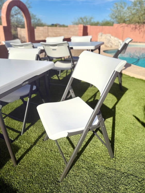 Looking for sturdy tables and chairs for your next event? Our Lifetime tables and chairs are exactly what you need. These tables and chairs are strong, durable and offer a great look to any event. Each set comes with 1 table and 6 chairs!
